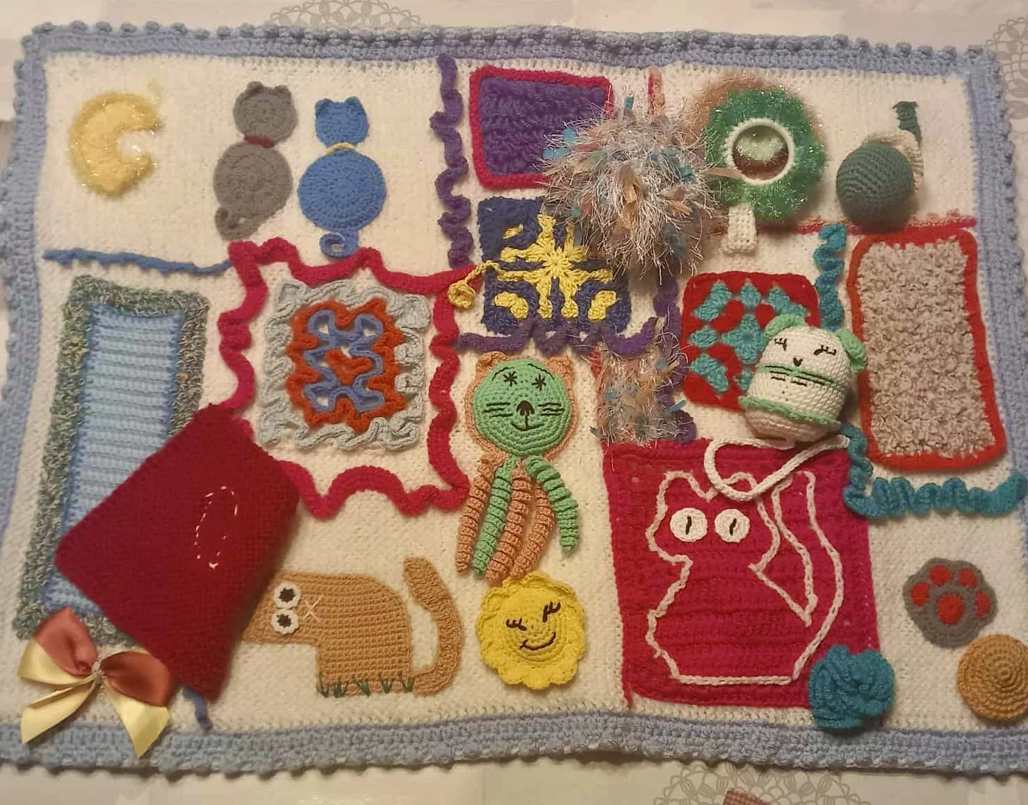 Cela commence avec un tapis sensoriel tout à fait unique, mettant à l’ honneur nos compagnons félins. Commandé à notre bénévole Colette par une dame qui malheureusement n’est jamais venue le récupérer, ce magnifique ouvrage est resté quelque temps en attente d’un nouveau bénéficiaire. Déçue qu’il ne remplisse pas sa mission, Colette m’a contactée pour savoir à qui elle pourrait l’offrir à la place.